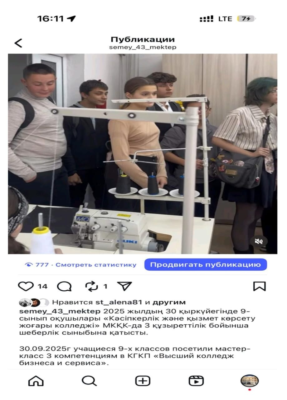 29 октябрь 2025 0 1 2 3 4 5 Профориентация КГУ «СОШ №43» отдела образования по городу Семей управления образования области Абай30.09.2025г учащиеся 9-х классов посетили мастер-класс п 3 компетенциям в колледже «Бизнеса и Сервиса» Педагог-профтирентолог: Асылханова А.Р.